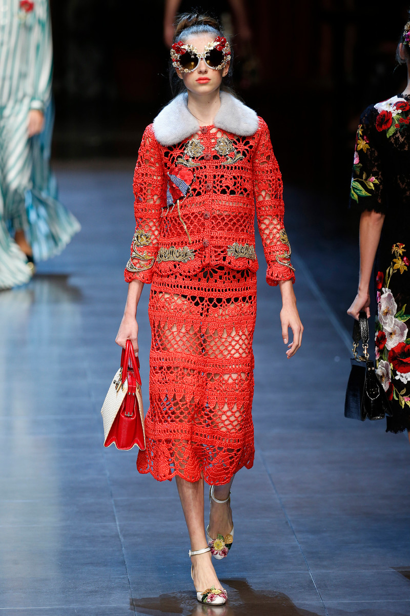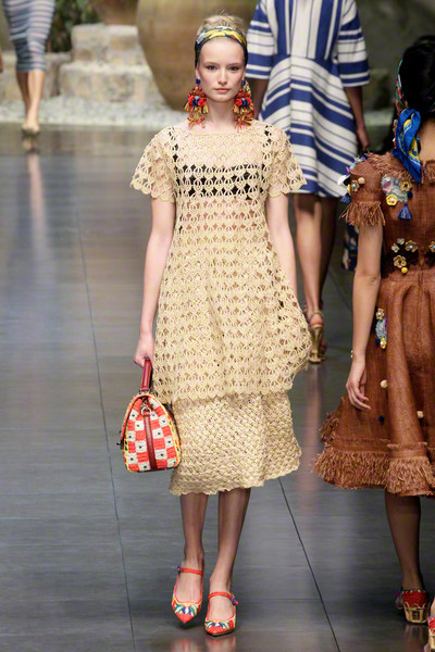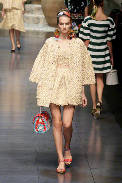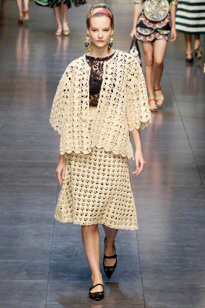 The Italian kitchen with all its colors and the traditional way Italians celebrate festivities was the inspiration for Dolce & Gabbana’s spring summer 2012 collection. The designers imagined themselves a small town in the South of Italy, decorated for festivities. The whole show and stage recalled the typically Italian joyful spirit: from the distinctive illuminations that adorn every street and the fragrances and tastes of Mediterranean food, down to the crochet that embellishes tablecloths.