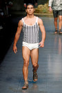 Visible on the catwalk were prints that represented the classic mythology through the faces of Zeus, Apollo and of antique temples. Besides the stretchy and tight-fitted suits (mostly in white) were blousons mixed with linen pants, shorts.