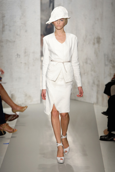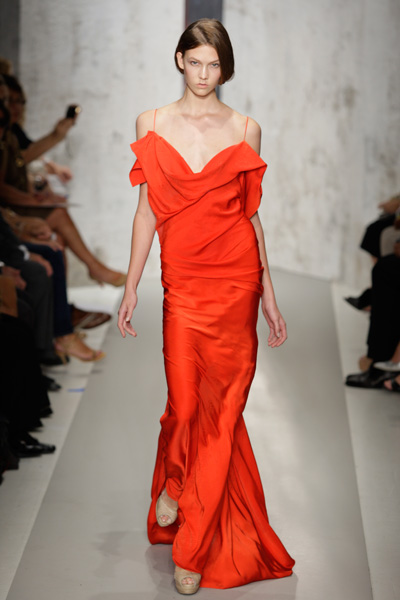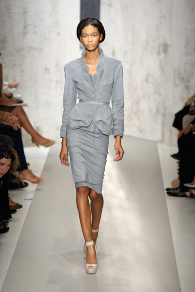 Donna Karan knows what she’s good at. She sent out a wearable collection of soft skirtsuits and body-loving draped dresses. She explained that she was “inspired by the power of the elements”. It could be the wind, as a hem of the opening stretch linen jacket, for example, was molded as if the model had just encountered a stiff breeze on the runway. The effect was a sense of movement and a pretty femininity. Twisting around the body, Karan’s dresses had a weightless, easy appeal. There were stretch matte jerseys in blush, and wrap styles with more volume in gray and white. Among the many pale neutrals , the bold reds stood out.