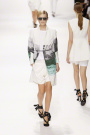 The collection Dries van Noten sent out this afternoon was build around various themes. One seemed old couture, regarding the tailored trousers, peplum pleats and drop-waisted dresses & tunics with a frilled bottom. The strongest however were the photoprints of city’s by night, nature, leaves, trees and flowers, it looked as if the designer copy-pasted parts of images into one print. It gave a contemporary character to classics like mens shirts, dresses and skirts. It also added some color now and then, green, pastelshades, blue and green. White, black and sepia were also favorites.