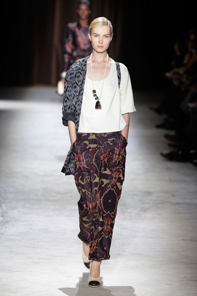 It’s been a long time Dries van Noten used his famous and favorite ethnic influences to create a collection. Somehow it never went away, it just waited under the surfaces of other collections to be used when required. After a sober, classic but colorful winter-collection Dries van Noten went East again. This time very restraint, elegant and somehow French. It was the arty jewelry (wit big crystal-stones), two-tone shoes, wet hair and bare faces (no make-up at all ) that gave it an intellectual touch. Van Noten mixed his all time classics in different prints – batik, ikat, stripes, Chinese embroidery – and beautiful colors from aubergine and black to white, red, blue and beige. The game was played by texture, print and proportions. Stiff 3/4 trousers, flowing silk dresses, skirts hanging on the hips with too short sweaters. It was sporty, chic and ladylike with a masculine touch. Perfect clothes for grown up women who want to dress fashionable and beautiful without screaming it out loud.