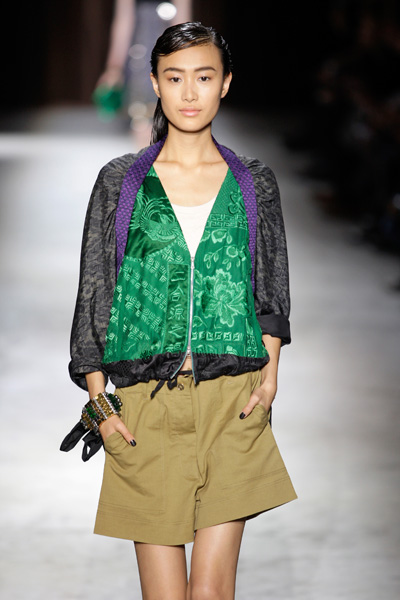 After a couple of seasons of citified dressing, collectors of Dries may well be pining for his more eclectic, decorative pieces. If so, they’ll find plenty of them: coats, soft boxy jackets, wrapped dresses, and sarong skirts in a plethora of fabrics and embroideries that looked as if they’d been sourced from a trip around the markets of China and Southeast Asia.