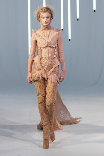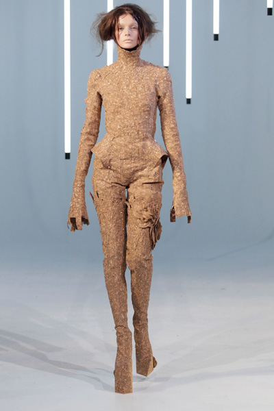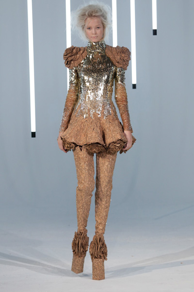 Dutch designer Jan Taminiau seemed to be the first designer to kick off Haute Couture week in Paris, unofficially that is. While everybody was awaiting the Dior couture-show (is there already a new designer?), Jan prepared his collection quietly. Nature Extends is the name of the collection, that was an unusual mix of cork and rich, flowing materials like chiffon. The fabrics and materials were sculpted into long, dramatic high collared dresses and tight suits. Colors changed from silver sequins into gray, taupe, brown/yellow.