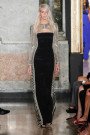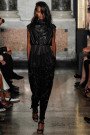 Peter Dundas, the British designer working for Emilio Pucci, surprised the audience with a complete different collection – far from Pucci heritage of paisley swirls and moving prints. He took his own wardrobe as a starting point. So masculine tailoring and fabrics dominated, as did black, and a minimalist hugging silhouette. The focus was at tight dresses with sexy splits and slits revealing slices of sheer, he also used velvet prints at sheer fabrics. Later the same idea got more bejeweled. For evening Dundas suggested beside the sexy dresses classic tuxedos, or tuxedo-elements.