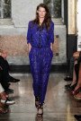 Dundas opened the show with a long purple jersey dress in a houseprint from the Pucci-archives, but he dip-dyed it in purple. This set the tone for the rest of the collection with ultra, ultrashort dresses – even the models were complaining about it – fringed scarf-dresses and big feather details. New were the tailored jackets in strong, clean lines. They were mixed with high waisted, suede flares. Eveningwear was pure glamor: long dresses with plunging necklines or minidresss with gold lace inserts and high slits.