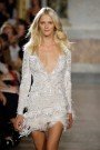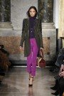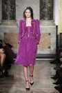 Dundas opened the show with a long purple jersey dress in a houseprint from the Pucci-archives, but he dip-dyed it in purple. This set the tone for the rest of the collection with ultra, ultrashort dresses – even the models were complaining about it – fringed scarf-dresses and big feather details. New were the tailored jackets in strong, clean lines. They were mixed with high waisted, suede flares. Eveningwear was pure glamor: long dresses with plunging necklines or minidresss with gold lace inserts and high slits.