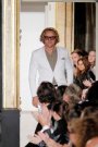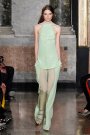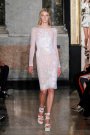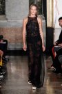 Peter Dundas, the British designer working for Emilio Pucci, surprised the audience with a complete different collection – far from Pucci heritage of paisley swirls and moving prints. He took his own wardrobe as a starting point. So masculine tailoring and fabrics dominated, as did black, and a minimalist hugging silhouette. The focus was at tight dresses with sexy splits and slits revealing slices of sheer, he also used velvet prints at sheer fabrics. Later the same idea got more bejeweled. For evening Dundas suggested beside the sexy dresses classic tuxedos, or tuxedo-elements.