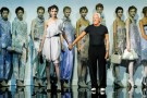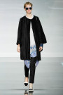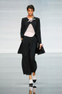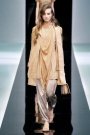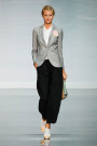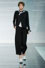 As always Giorgio Armani is choosing his own direction when it comes to fashiontrends. For him no fancy colors, no Mod-style, no dressing up at his Emporio Armani-collection. Instead he plays his well-know play with fabrics, textures, black and white. He got inspired by a film noir, where beauty is concealed behind a pair of dark glasses and under a hat. This resulted into a total black collection, with flashes of white and blue. There were jumpsuits, sharp cut full trousers and sculpted jackets. The silhouette was long and fluid with raw-edge finishes, fabrics were matt, velvety and mongolian fur added a touch of luxury.