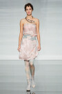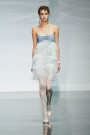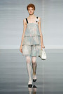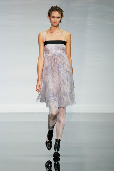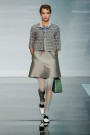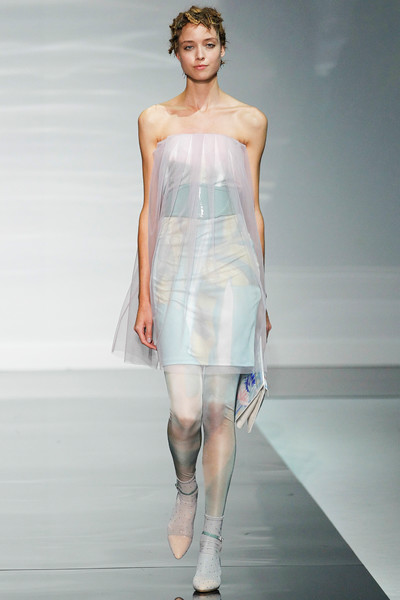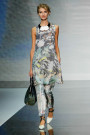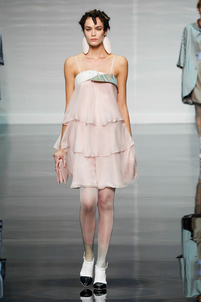 According to the pressrelease the collection of Emporio Armani was concentrated around ten elements: glamour, geometric deco, lightness, sheath, daywear, sleekness, shades , shape, form and fancy. Well, it briefly told what the collection was about: different layers of different shapes created new (sleek) forms, stretch see through tubes and leggings tamed the short dresses and skirts, minreal shades got company of green, black and watermelon red.