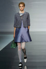We saw cut out jersey jackets, combined with striped, structured skirts and berets. Models wore knee high shorts with woolen vests and wide decorated hats. Fringed coats were presented next to tweed and polka dot versions. And there were some peplums in the mix as well.
