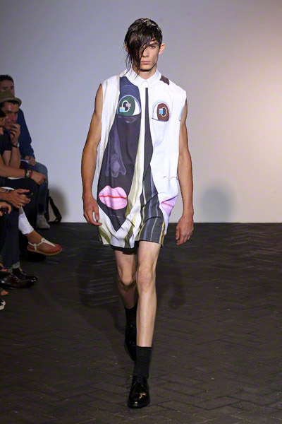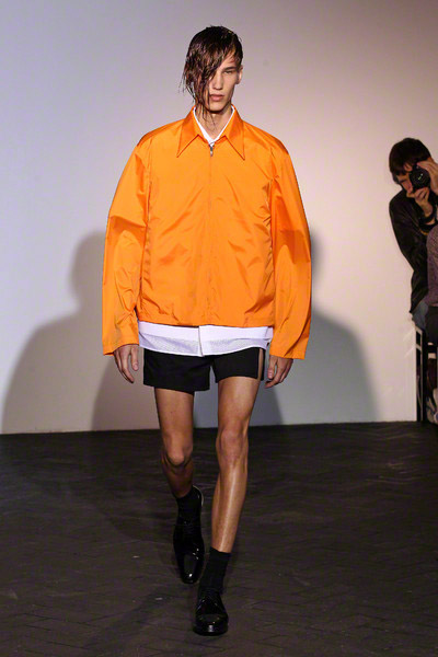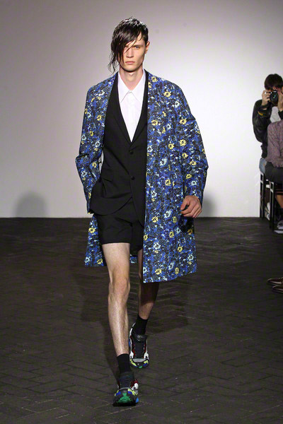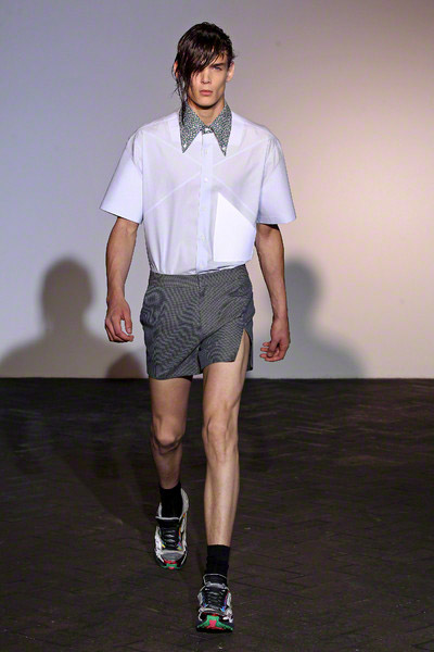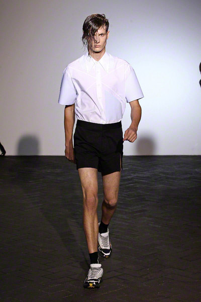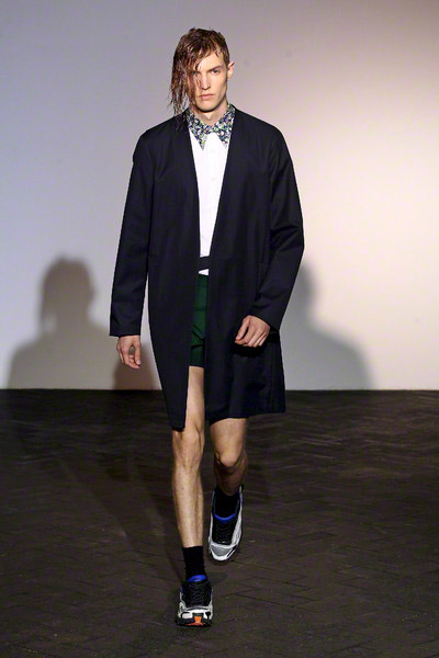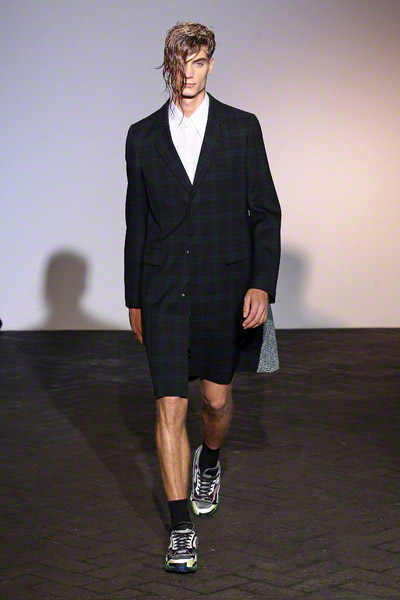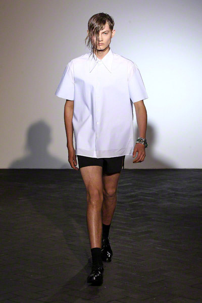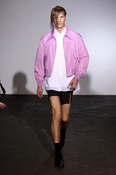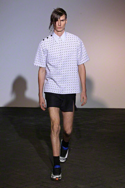 Raf Simons took elements of masculine and feminine dressing and mixed those into a sporty, tailored collection. Delicate floral prints, pleats, broderie anglaise and shades of pink were applied to modern, angular silhouettes. The models – with long, wet bangs – wore shorts with slits, boxy white shirts or overcoats with backs in floral prints and pleated skirts. Simons also presented long pants worn with colorful sneakers. Some T-shirts had illustrations of women.