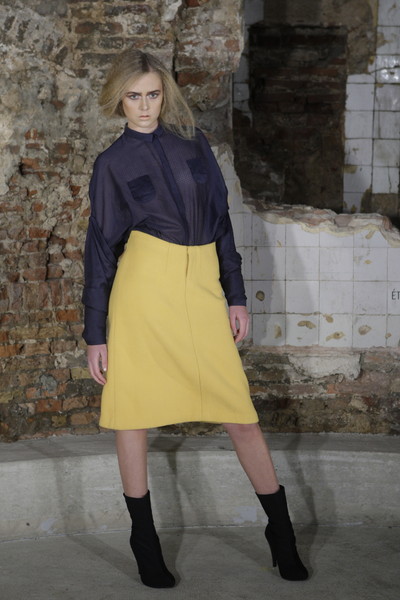 Lifu Hsiao gave his designs a very own twist by adding reversed shoulder pads, A-line skirts and lots of zippers. As a matter of fact the models were all zipped up from their collars to theirs skirts, leg warmers and boots. The clothes were made out of nylons and polyesters combined with wools, silks, and cottons.