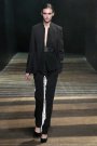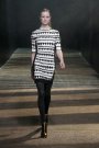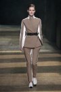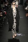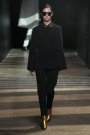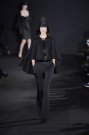 Donna Karan returned to chic urbanity for coming fall. The collection focused on a thin silhouette and men’s tailoring, often in pinstripes. Karan incorporated her signature a-symmetric style — half-collars, side-draping, off-kilter slits — and dared to revive an audacious shoulder. The dresses shown had an architectural, sculpted feel, as though the fabric – black matte crepes – had been simply moulded around the models’ bodies. She finished everything off with fabulous asymmetric hats. Eveningwear looked fresh with lean, constructed gowns and a nice mix of felted jersey and sequins on sheer fabrics.