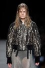 The color palette was a banquet of soothing neutrals. For all the designer’s insistence on cut, it was softness that dominated. A hooded mink coat and a Mongolian lamb backpack were its most extreme manifestations. Otherwise, jacquard-ed blousons and parkas had the comfy look and feel of blankets. The body-conscious cashmere knitwear in long cabled cardigans and even longer rib-knit tops, layered over leggings was lean and athletic. It took on an impressive masculine heft with oversized outerwear.