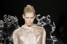 Iris van Herpen started her show with a clip of a naked woman surrounded by splashes of water. That water appeared to be essential in her collection. Her ten looks represented ‘Crystallization’: the process of water turning into crystal.