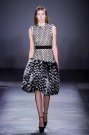 For next winter Giambattista Valli presented quite a sober collection. He showed knit dresses, checked coats, knee length skirts and sleeveless tops all with one and the same focus point; a wide belt around the models’ waists. Perhaps the designs were a little less sexy than in a average Valli collection, but it definitely fit right in with today’s trends. Looks were cosy and appeared perfect for a cold winter day. Yet some of these looks can be deceiving since some of the knits were actually trompe l’oeil effect printed on airy fabrics. Still, no matter what choice of fabric all outfits were perfectly balanced. Tops looked as great with fur-ish skirts as they did with transparent pleated ones. Some full on graphical printed (and colored) looks (Marni-ish) and a golden croc leather coot stayed classy. And the sheer evening gowns which ended the show mixed covered sexiness with sophistication in a unique way. Now that is how you present a wearable cohesive collection.