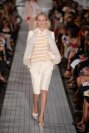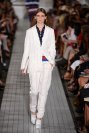 Tommy Hilfiger and his team brushed up two classic themes – safari and nautical – and made it into an upbeat and interesting collection. It was big and lively, with new interpretations of sailcloth, stripes, and fisherman knits, among other staples of the seafaring look. The oversized red, white, and blue suit jackets, slouchy patchwork denim, and swinging tent dresses boasting sexy open backs looked refreshing and good. And many of the pieces benefited from unexpected finishes, such as the boxy navy-striped sailor’s tee, with a slick, stiff coating of wax. Yet for all the emphasis on the American palette, there were a great deal of washed-out sandy tones, too. They looked crisp and clean, though not obviously safari-esque, on cable knits and summery leathers.
