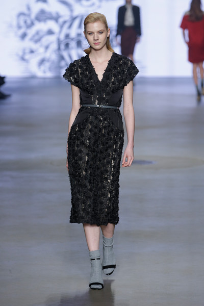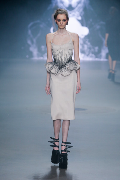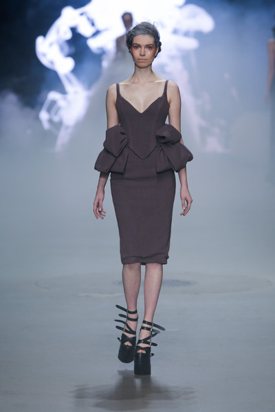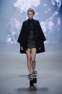 Not only do those towering high fashion shoes make a more dramatic catwalk image, they can be painful and dangerous too. Tonight Dennis Diem showed just how dangerous they can be as he sent out his models on sky-high black shoes. After a few tumbling and stumbling models one of the girls really fell flat on her face. It gave everyone in the audience a heart attack, yet turned out to be an act (what a relief!). It drew our attention away from the clothes for a brief moment, but luckily Dennis’ creations, inspired by opium and the movement of smoke, were just so gorgeous we couldn’t keep our eyes off of them. From a wall of smoke models appeared in a selection of (mostly) monochrome dresses with a slight rebellious touch. Sexy corsets (Diem’s signature) were attached to pencil skirts and floor sweeping dresses with lots of tulle to create that extra romantic vibe. Cashmere capes added some extra drama and shiny sequins gave the looks a dreamy touch. With a focus on shoulders and hips the designs were even more powerful. The fairytale was complete once Dennis received his applause while walking the catwalk accompanied by two of his princesses dressed in impressive off white dream gowns.