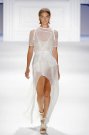 Vera Wang tried a different path with her ss2012 collection. More psychedelic colors and prints, different shapes and volumes, new colors. But the result was too much fairytale and less reality. Tiny little vests with detachable volants in cotton and oversize eyelet. Skirts made from sheer parachute silk that grazed the thighs in the front and trailed weightless in the back. Gowns with diamond-shape cutouts on the chest. Gauzy leggings. The effect looked a bit forced.