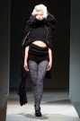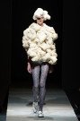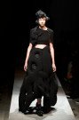 We started our morning with an all black Watanabe collection (including the strangely cut black wigs the models wore). Dark it was, dull not at all. With every single look the designer managed to portray his strong craftsmanship. He introduced round (and rectangular towards the end) shaped patchwork details and gave his creations a 3D effect by layering multiple textures on top of each other and bundling woolen, leather and fur pieces of fabric. Sequined pieces were in the patchwork mix too, followed by architectural Michelin-like coats, one could live in. Long dresses with straps of ribbon attached vertically onto sheer fabric formed the finale of what appeared to be clothes for a night out. Some looks might come across a little too bizarre for hitting your average night club, although seen independently, without the extreme show styling, some of the tops or bottoms could definitely work in any metropolitan city.
