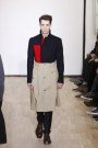 After two seasons of modern suits with that typical Belgian edge, Raf Simons pushed again the boundaries of menswear. He already played the game of closures at his collection for Jil Sander (with mixed results), but it worked out much better for his own fall collection. Still suits form the center part (but as the designer said earlier: he and his clients are grown up men now), Raf still favors dark colors, but he replaced the buttons with metallic magnetic closures and velcro strips which made a pretty tight silhouette and clean image. Simons also re-made the traditional trench by separating the coat into halfs and using the lower half as a skirt or protective shield. Besides that he played an interesting graphic game with red, white and blue.