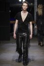 Since Martin himself is no longer on board Maison Martin Margiela has been rediscovering itself. Today’s collection was proof of that as it was not the most coherent line up. Yet the fashion house did present some strong designs that proudly carried the name of the French fashion label. Oversize and menswear seemed to be the red line in the show the houses described as a “rally” in the show notes. Overall, suits, pinstripe waistcoats (and quite a few other ones – patent leather and fur – too). Black and white looks were given a hand painted yellow or pink twist as more color followed on patent orange and red leather and strangely crafted, multicolored mesh tops. The finale of floor sweeping panel dresses that seemed to have some kind of ad texts on them appeared to be a whole other chapter of the Margiela fall collection.