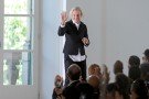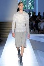It was Geraldo da Conceicao’s debut collection for Sonia Rykiel, since the brand got it’s new owners Fung Brands Ltd. last year. For his first collection he managed to mix Sonia’s signatures with his own skills and preferences. Knitted suits with playful buttons opened the show, followed by a selection of knitted dresses that fully breathed Rykiel. The next black leather, more architectural pieces seemed more of Geraldo’s personal thing yet they were quickly followed up by more knitwear. Casual pieces worn by bra-less models and business chic designs like a baby pink suit jacket and a baby blue ensemble. A trio of printed tunics perhaps looked a bit out of place, yet the finale sweaters (with kisses and flowers) brought back that joyful Rykiel feeling. It might take a while before Geraldo da Conceicaso has fully found the right direction he wants to go with the brand, but he’s on the right track.
