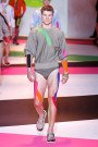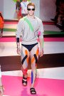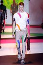 Donatella Versace presented a playful collection full of shine and neon shades — models even wore thick strips of colored sports tape here and there on their bodies . There were leather jackets glistened with gold studs and zips, big rippling Medusa head on the back of shirts, and sheer black lace dress shirts. Then there were clean-cut tailored suits with a roomy silhouette, shiny buttons and strong shoulders, jackets paired with shorts and trousers that gather, tracksuit style, around the ankle. And for all those party-animals there were neon paint-splattered jeans, sweatshirts, and boiler suits that reveal a man at play. Wow.