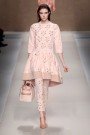 Known for her sweet, soft and girly designs Anna Molinari did not disappoint on Friday. Pastel shades sweaters, coats and (unflattering) pleated pants opened the Blumarine show. Knitted hot pants were mixed with fur-like coats in the same shade as the nude colored footwear seemed to almost be one with the models’ feet. A menswear inspired section in the middle of the show (with a tweed cape, hounds tooth printed fur and a checked suit with statement shoulders) woke everyone in the audience up, before continuing with baby blues and vale pinks. Classic Voluminous shirts with bow details and ruffled skirts were right up on Molinari’s alley. As a few sheer T-shirt dresses and pleated short skirts added a welcome young touch to the collection.