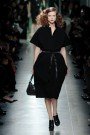 Tomas Maier’s Bottega collection today wouldn’t strike you as showstopping or mind blowing by taking a quick look. For the show attendees in the sixth row the designs probably just appeared as beautiful creations and we’re sure even the front rowers wouldn’t have been able to see what the clothes were all about. Yes the dresses looked well made and chic, but there was a whole lot more going on. Tomas experimented with fabric construction and chose wool as his main material. “I was into wool, and using it in different ways, washing it, bonding it, or felting it to create print”, he stated backstage. He managed to make wool look sexy and used it to create structured shoulders, 3D peplum details and ruffled skirt pleats. Fabrics were embroidered in order to create several trompe l’oeil prints. In between his see of fully black dresses touches of color (red, beige, yellow) made a good match with the models’ seventies appearances. Lots of attention to detail on designs that definitely deserve a closer look.