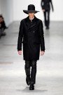 Today Ennio Capase almost sent out a completely black colored collection. But, proving the power of black in fashion, there was more than enough to look at. Capase paired tough with chic by mixing leather pants with woolen coats and by giving other coats extra biker details, like multiple zippers and strong leather collars and panels. Extremely tailored jackets and classic hats added to that contrast. Touches of white and blue cheered up the collection, but it didn’t change the long haired models’ bad-ass mood. They were perfectly dressed rock ’n rollers on a mission.