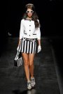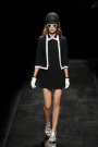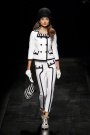 Regarding the round helmets, short A-line shifts and military buttons, Moschino went for Sixties Pop. It started with graphic black-and-white worked in bold contrast on piped dresses and suits, cropped jackets, mini skirts and a little tank jumper.