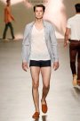 Sexy, muscled men with smoky eyes walked today’s Allan Vos LAB show. Designs were tough and feminine at the same time. The show started with a tight fitting blue suit with black details and tiny yellow beads. He carried a matching handbag with a big A on it, like there were many more in the collection. What followed were extremely wide and extremely tight pants. The wide ones were pleated and seen from certain angles looked like skirts. The leggings were worn with boxers over it, highlighting the models crotch area. Leather jackets gave the collection a tough touch, while fur coats and tight tank tops (again with the letter A on it) had the opposite effect. Several variations of the white shirt (including one at floor length) looked interesting and a well tailored black jacket with red lining could just become the best sold item of the show.