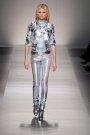The glitz and glam theme started off subtly with silver shaded ankle boots, yet soon the full on shiny grey-ish/silver looks (skinny jeans and trench coats) appeared. They were followed by ensembles (snakeskin shorts, skirts and old skool jackets) in other metallic tones like light pink, gold-ish and light blue. And towards the end the shiny was even introduced on a few disco chic biker jackets, with every possible shade reflected in them.
