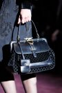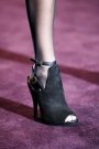 In a palette of purple, navy, forest green, dark brown and black Frida Giannini presented a dark, romantic Gucci collection. She called it modern day romanticism, wit a touch of military, dandy and elegance. There were flat heeled riding boots, wide cut, cropped jackets with gold buttons and softly belted velvet smoking jackets. There was more velvet in the appliqué flowers on translucent chiffon and lace blouses. Skirts had a split in the back, riding trousers flounced wide over each thigh and the full lengtht column dresses were shiny and glittering. Giannini focused on day clothes worn in texturally intense layerings. It sometimes reminded of good old Yves St. Laurent.