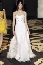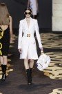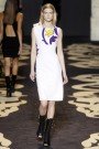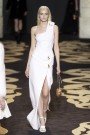 The pleated skirts and jackets, cut from hard, thick leather, worked the pretty side of tough chic while a long white coat sported patchworked fur sleeves. And if Versace showed fewer eveningwear contenders than usual, no matter. The sexy goddess gowns she did send out, with bondage-y busts and gentle feathered trains, were striking.