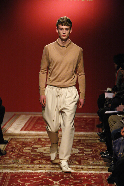 Apart from a pair of bright pink socks and shoes the collection’s colors were very modest (and masculine).