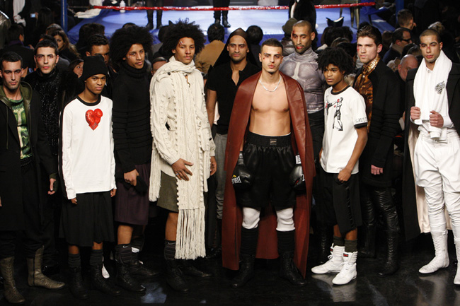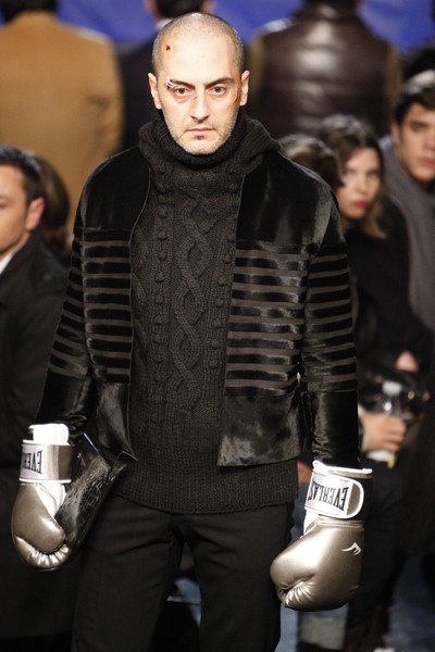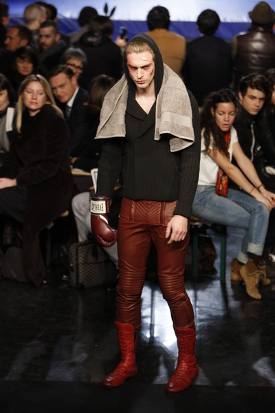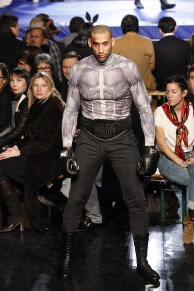 The Jean Paul Gaultier fashion show opened with two girls fighting against each other in a boxing ring that stood in the centre of the stage. Then beaten up models in JPG designs and boxing accessories came on stage. They wore face protection, boxing gloves, belts with the JPG logo and carried towels around their necks. They had bleeding noses and band-aids all over their faces, as if they had just been beaten up.