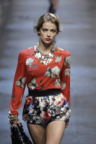 The prettiest floral prints were those of Dolce & Gabbana. Their perfect shapes and colors could be seen on r dresses, shorts, tops, jackets and lingerie. In one look a floral printed skirt was even mixed with a leopard printed top. Both with black lace on the edges.