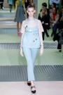 Prada opened with neat Sixties shapes she’s worked before, but now in technic foam, mixing girly and acid colors to quirky effect (“Soft Pop” was a title for the collection). Trim jackets had schoolboy spunk over cropped bell-bottoms, and shared the runway with lady coats and beautiful high-waisted dresses in cuts derived from midcentury couture. Again, the designer veered from the obvious, perverting the look into baby-doll tunic-over-pants ensembles.