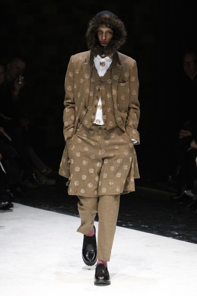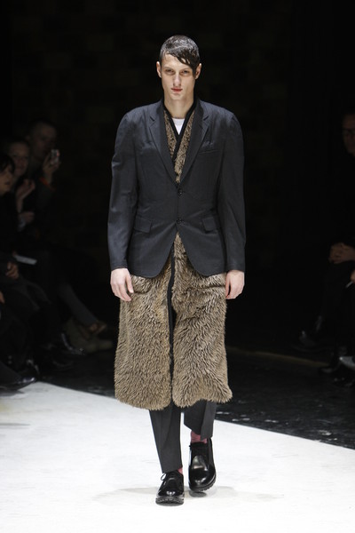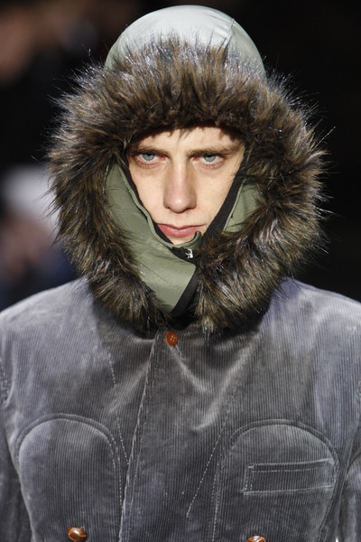 The first models that came on the runway at the Comme des Garcons fashion show wore corduroy outfits and hoodies with fur, which covered a big part of their faces.