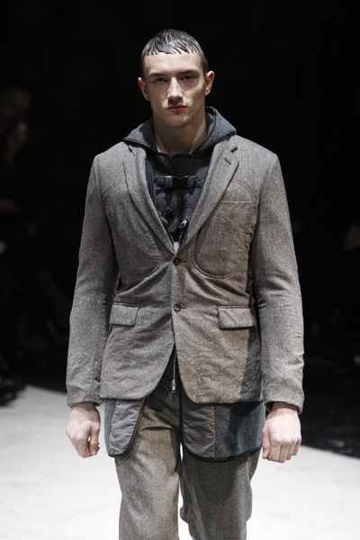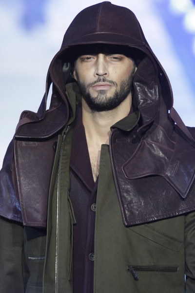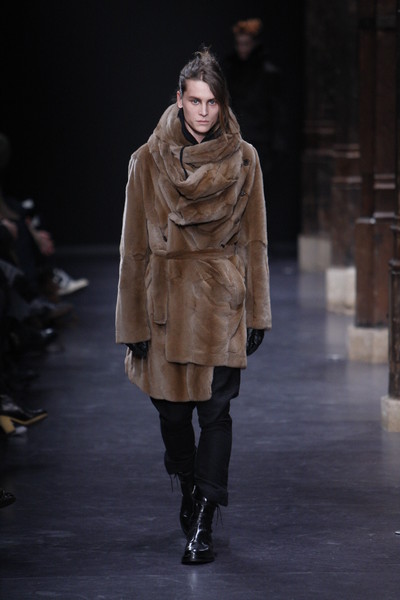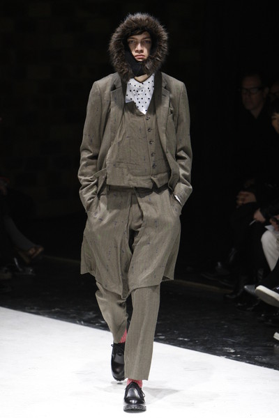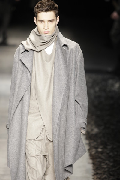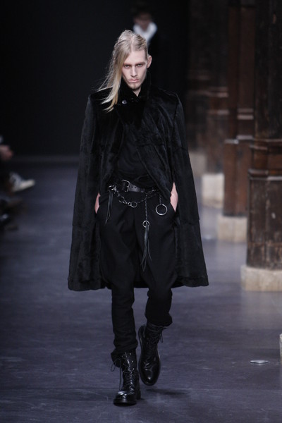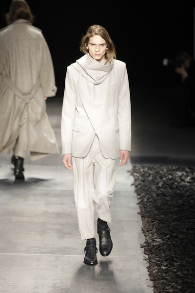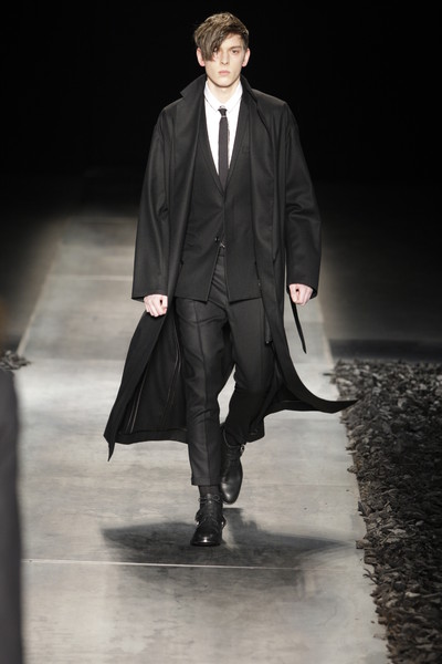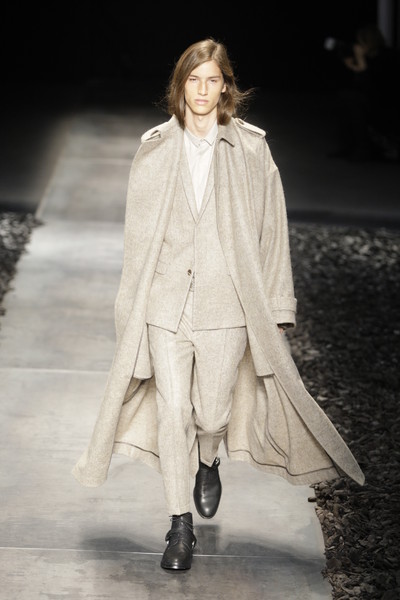 Floor sweeping trenchcoats, hooded robes and cropped suits with boots dominated the collection. Innovative variations on the classic suit, which van Assche slashed and distorted, giving it new proportions and a faux Amish Country silhouette. Luxury, creativity and comfort were the guiding principles of this fall-winter 2010 menswear collection.
