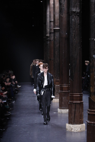 Sisters of Mercy’s ‘Temple of Love’ reverberated through the dark, cavernous hall where the Dior Homme-show took place. The set was spread with chunks of coal — a reminder of the kind of warm, smoldering color designer Kris van Assche had in mind while designing the collection.