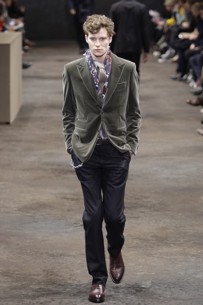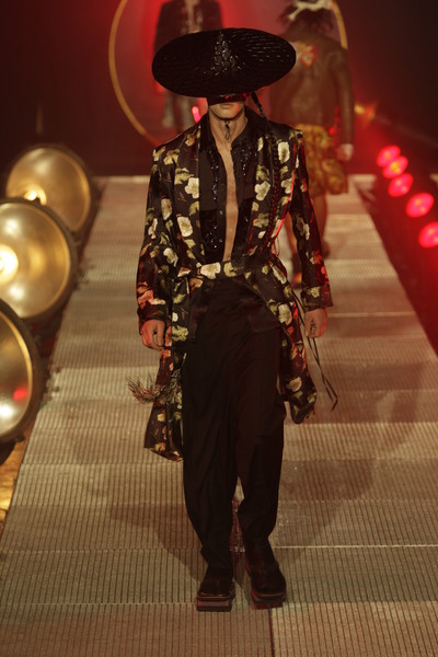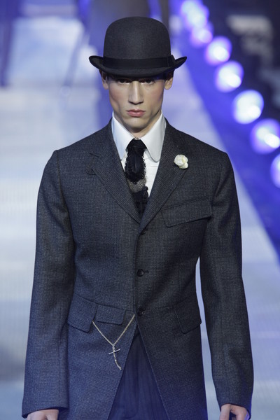 According to the show notes with this collection Galliano evoked the multi-faceted personality and lifestyle of Sherlock Holmes. This lead to four different types of men appearing on the runway.