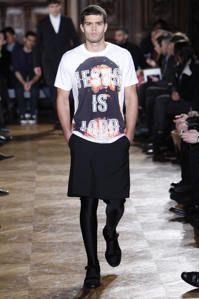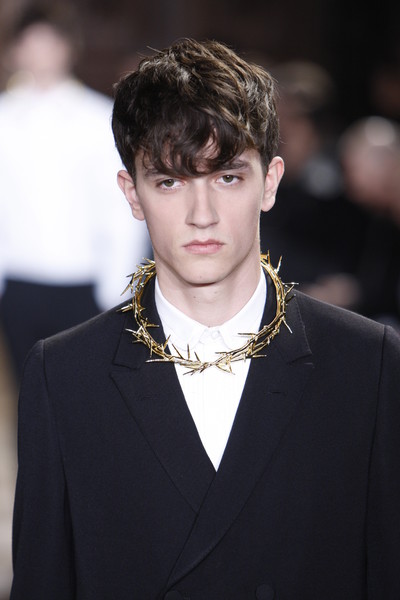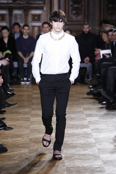 What would Jesus wear nowadays? If he shopped at Givenchy, he’d wear sandals, black stockings, a kilt, shorts and a gold crown of thorns necklace. The models at Givenchy looked like modern monks in their black and white clothes, black sandals (sometimes with, ugh, black shiny stockings), high collars and long coats. No laughs, no fun – this was serious man! But without all the fuzz, the basic collection is about a suit, a puffy jacket, a kilt, a white shirt and a long coat. Enough to mix endlessly.