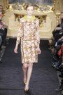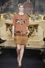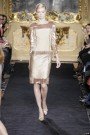 But the design duo kept away from the YSL-way of interpreting the Mondrian-theme, instead they only used the gridlines on the flapper-style dresses made from velvet and lurex, some embellished with geometric bead embroidery or ostrich feathers. Rich coats were made from boiled wool and interwoven with contrasting strips of satin. Colorwise Aquilano and Rimondi fell for burnished shades of copper and sienna plus lemon, orange and lime.