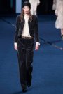 Christophe Lemaire opened his show with a group of platinum-card-holding gaucho girls, with tweed blanket shawls fringed in black leather, ballooning pants tucked into boots. The South American accent gave an sexy accent to the masculine tailoring. The sizing was loose and generous. The outerwear was strong, especially woolen coats and capes in green. There was also a Hermès version of the tracksuit: T-shirs, cardigan and slim pants in light suede in spicy shades. For evening Lemaire suggested silk skirts in foulard prints and loose velvet tops.