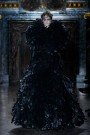 Inspired by the Asgarda tribe, a group of Ukrain warrior women who segregate themselves from the everyday world to become strong and independent the designs indeed seemed to empower as the models wearing them looked tough and confident. They appeared feminine and Victorian in Pugh’s long and lean silhouettes (in shades of black, white, grey and blue) with raised necklines and dramatic floor sweeping skirts. Structured leather and gold embroidered silk looked both Gothic, romantic and futuristic. Simple T-shirt inspired tops with chic pockets (a reference to the Asgarda women) added a new minimalistic approach to Pugh’s line. They formed quite the oppossite of the series of black finale dresses, which got a little more drama with every look. Who would have thought trash bags from a one pound shop could look this impressive?