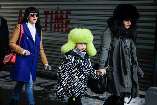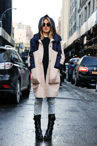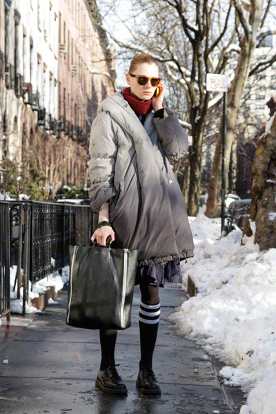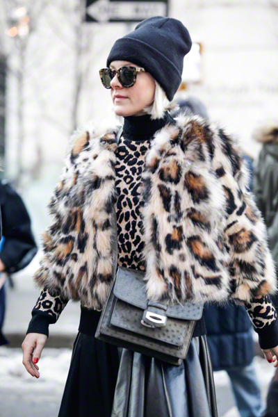 The DKNY Fall collection presented several of the label’s iconic items, including an oversize quilted bomber. It once represented “street style” when the term actually implied a little grit. Urban outfitting was the focus this season. Oversized parkas and sweatshirts were featured, as well as fun animal prints. Karan also added large rounded shoulders to her silhouettes, particularly on structured mini-dresses and tops that combined multiple fabrics including Neoprene.
