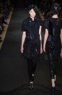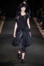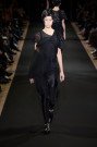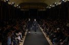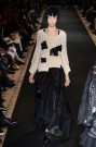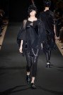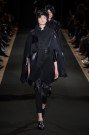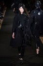 We started our morning with an all black Watanabe collection (including the strangely cut black wigs the models wore). Dark it was, dull not at all. With every single look the designer managed to portray his strong craftsmanship. He introduced round (and rectangular towards the end) shaped patchwork details and gave his creations a 3D effect by layering multiple textures on top of each other and bundling woolen, leather and fur pieces of fabric. Sequined pieces were in the patchwork mix too, followed by architectural Michelin-like coats, one could live in. Long dresses with straps of ribbon attached vertically onto sheer fabric formed the finale of what appeared to be clothes for a night out. Some looks might come across a little too bizarre for hitting your average night club, although seen independently, without the extreme show styling, some of the tops or bottoms could definitely work in any metropolitan city.